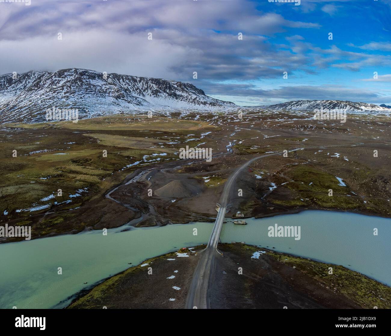 Old broken bridge and new one over glacier river Stock Photo Alamy