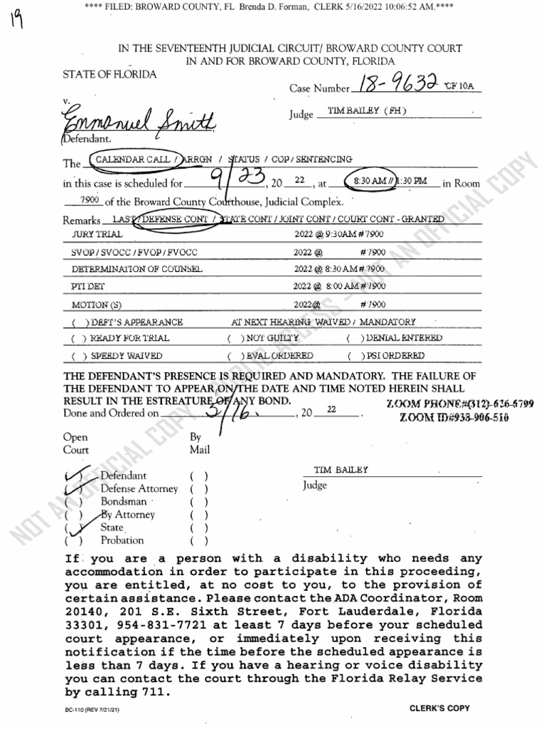 Emmanuel Isaiah Smith (Not Guilty) Broward County Court Case