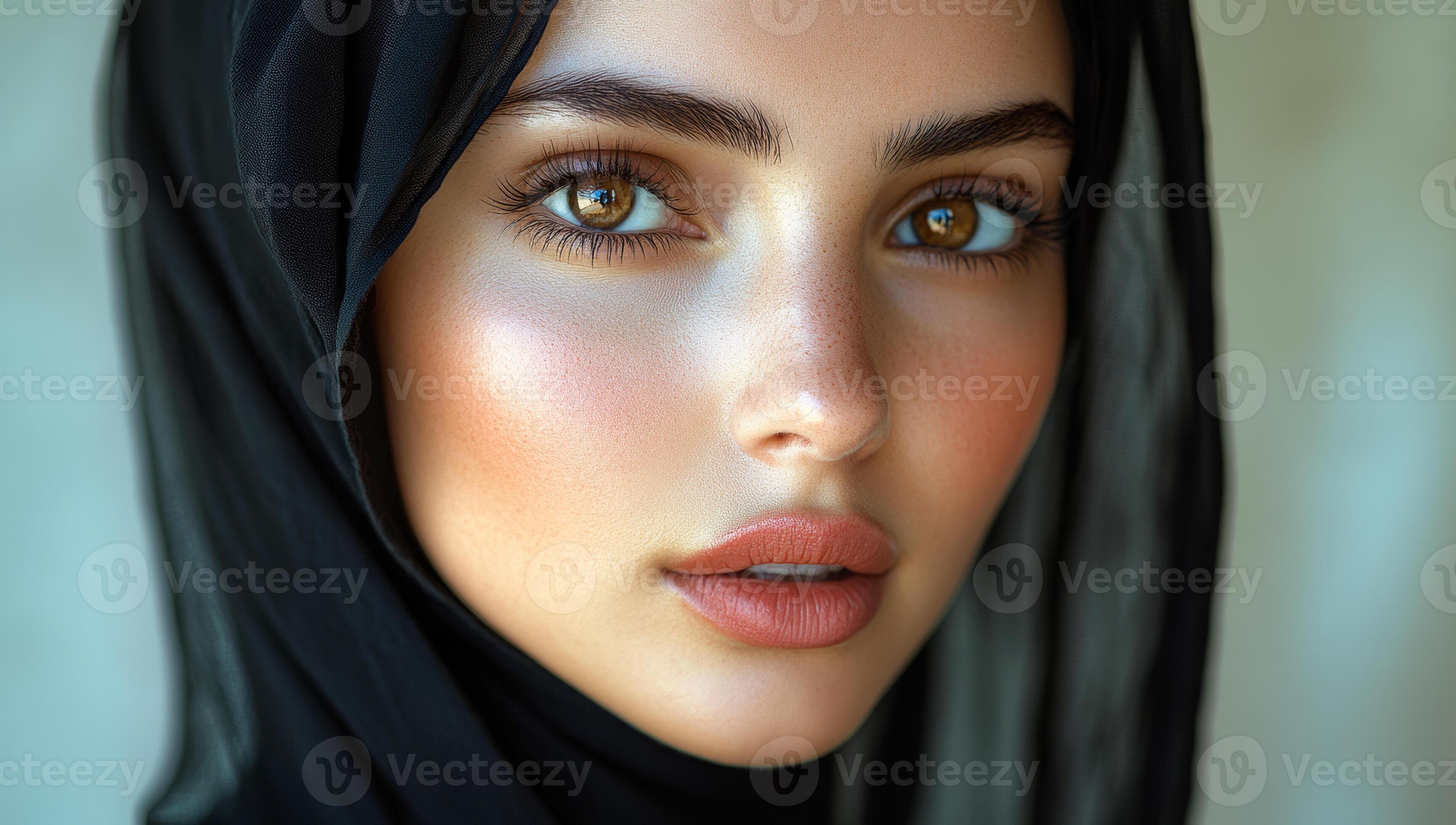 A woman with a black scarf on her head and a brownish tint to her eyes