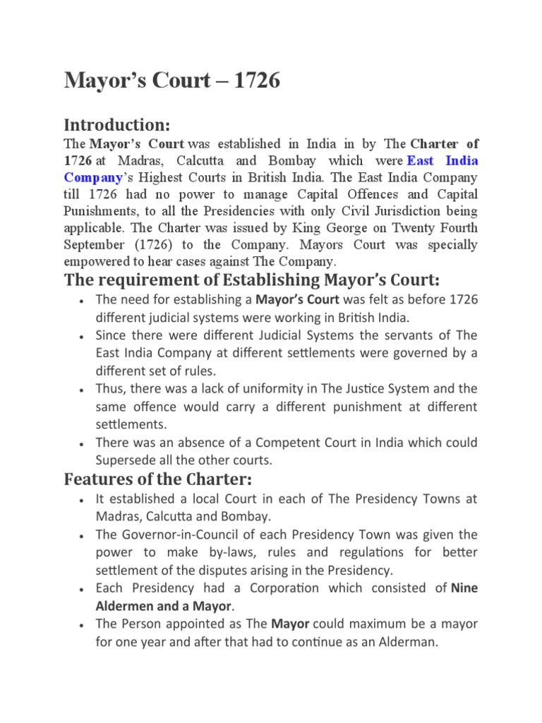 Mayors Court in India (Charter of 1687 1726 and 1753) PPT