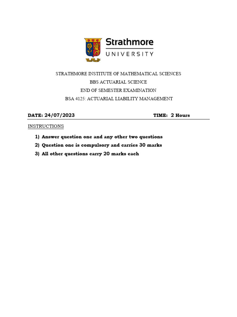 BSA 4125 Actuarial Liability Management July 2023 PDF Insurance
