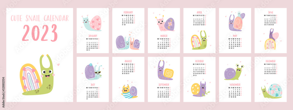Yearly calendar 2023 template with cute decorative snails on white