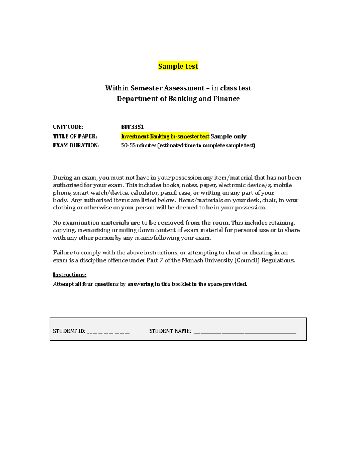 Sample MST Questions Sample test Within Semester Assessment ñ in