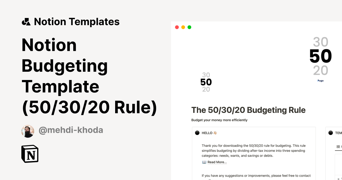 Notion Budgeting Template (50/30/20 Rule) Template by Mehdi Khoda