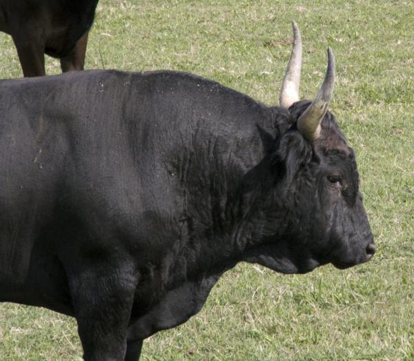 A Serious Bull with Big Horns in the Cattle Raising in Spain Stock