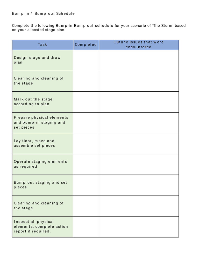 Bump in Bump Out Schedule PDF