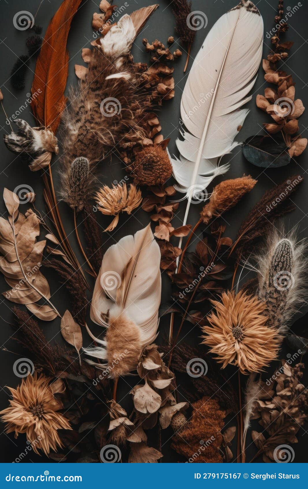 A Bunch of Feathers and Flowers on a Table AI Generative Image Stock