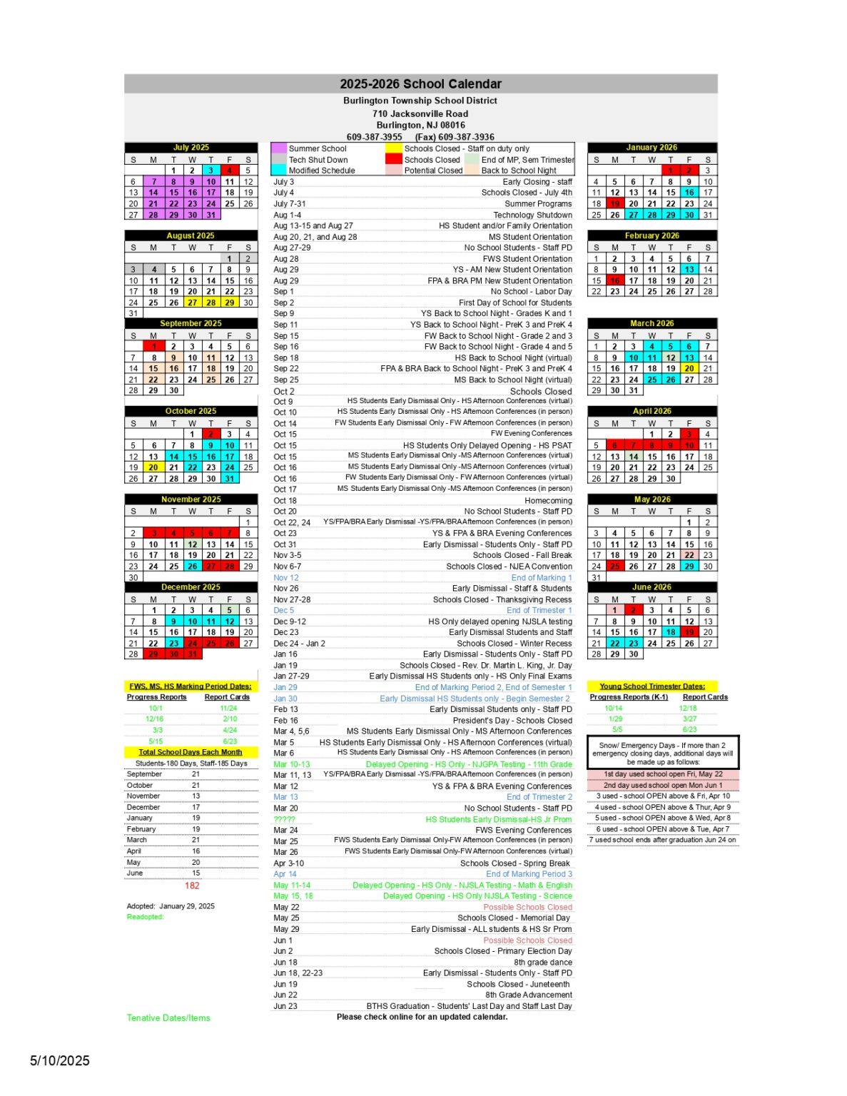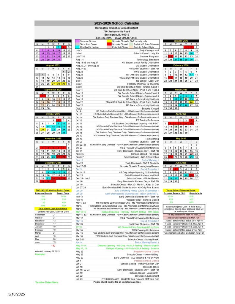 Burlington Township School District Calendar 25 26 Revised PDF