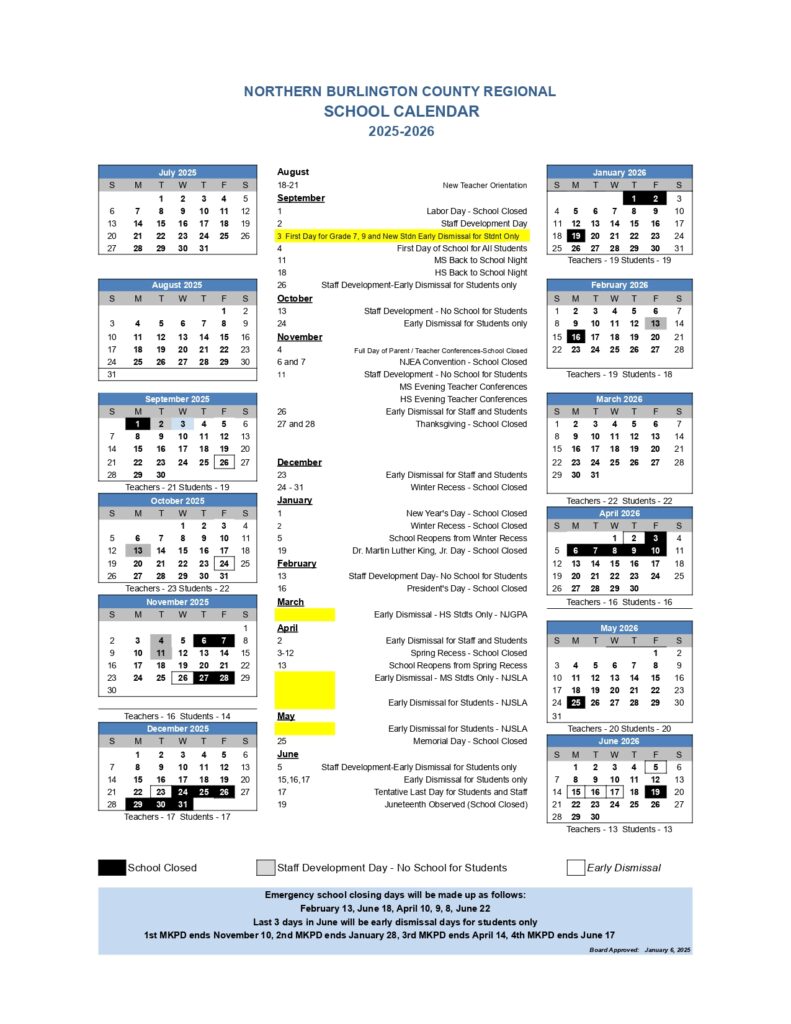Northern Burlington county regional school calendar 25 26 Revised PDF