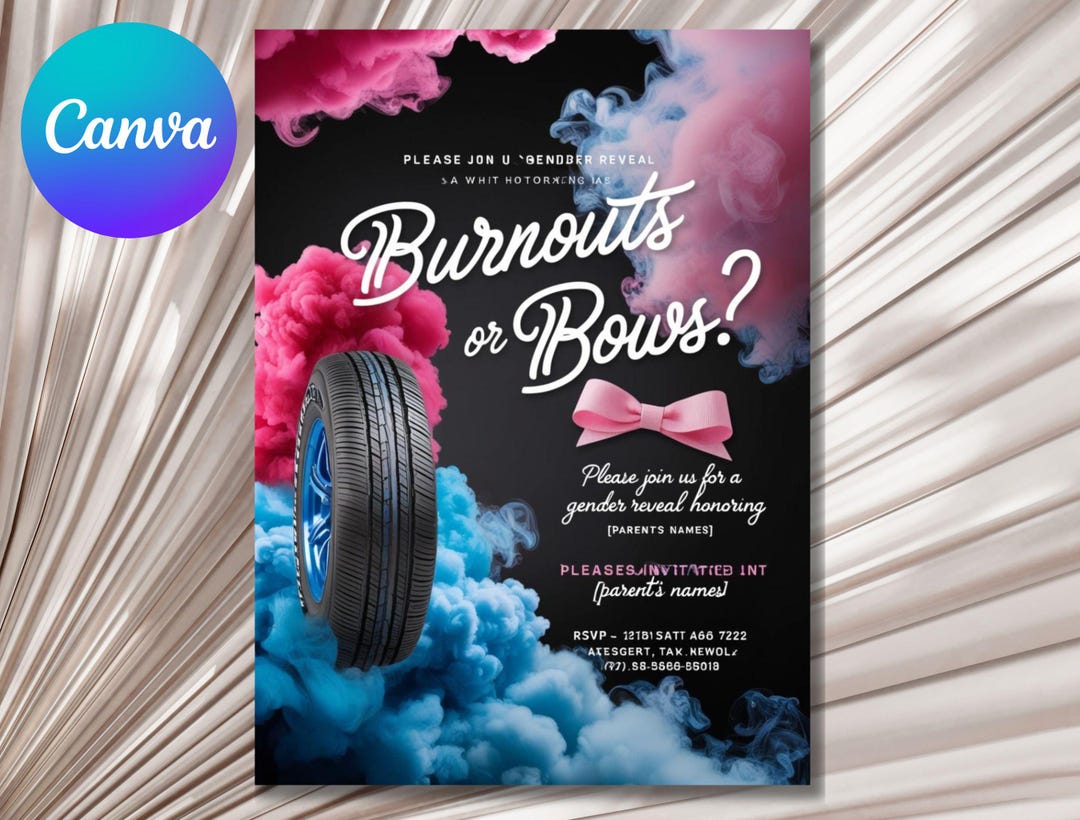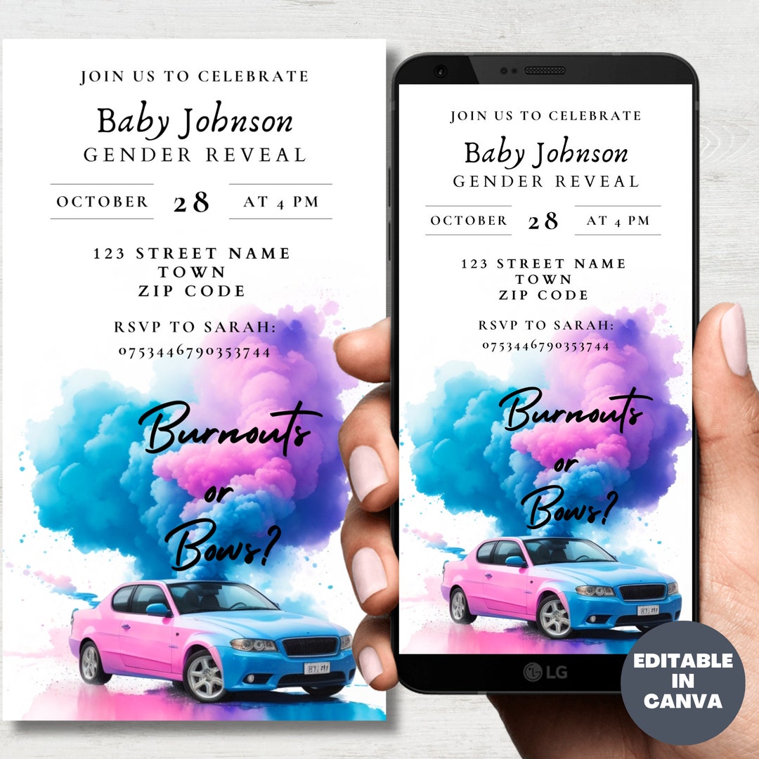 Editable Burnouts or Bows Gender Reveal invitation Cars Etsy