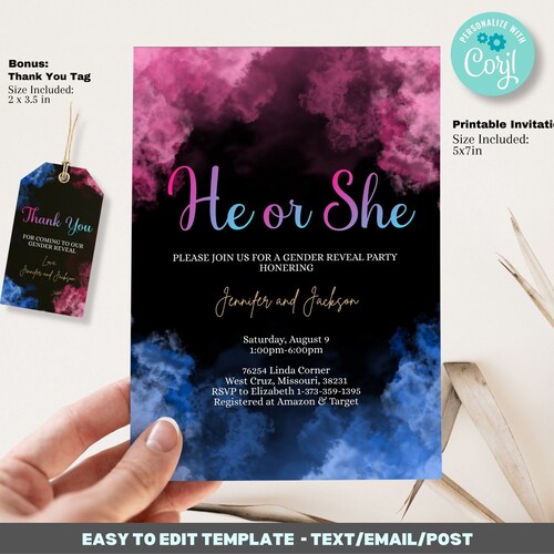 Burnouts or Bows Gender Reveal Invitation Template Digital Download