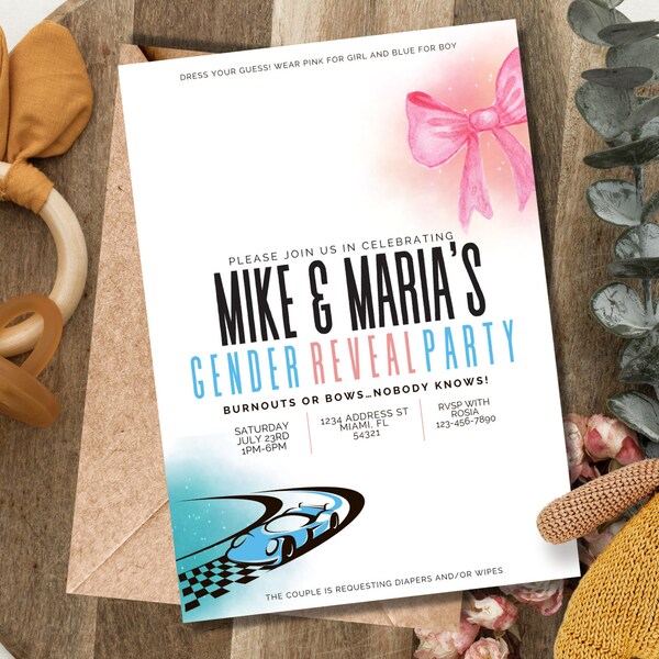Editable Burnouts or Bows Gender Reveal Baby Shower Invitation Boy or