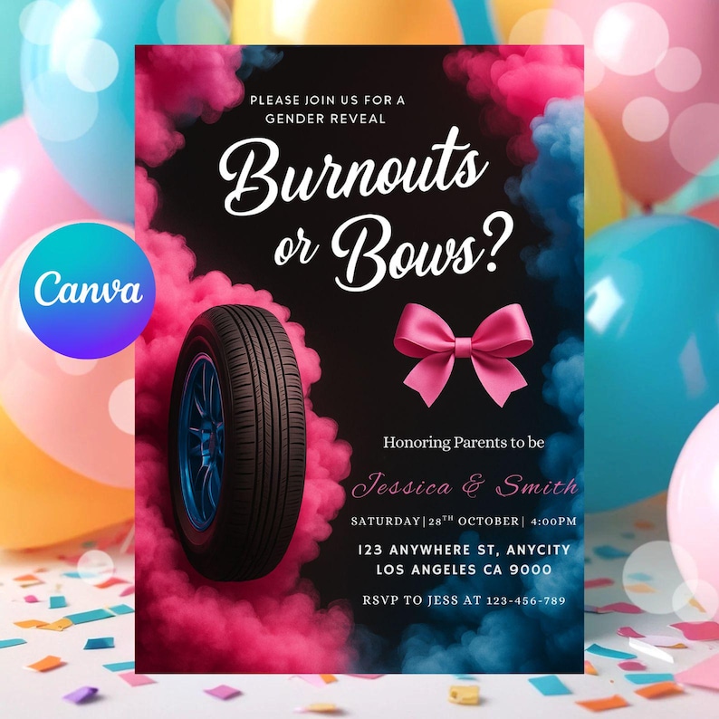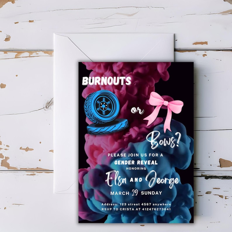 Burnouts or Bows Gender Reveal Invitation Editable Party Invite