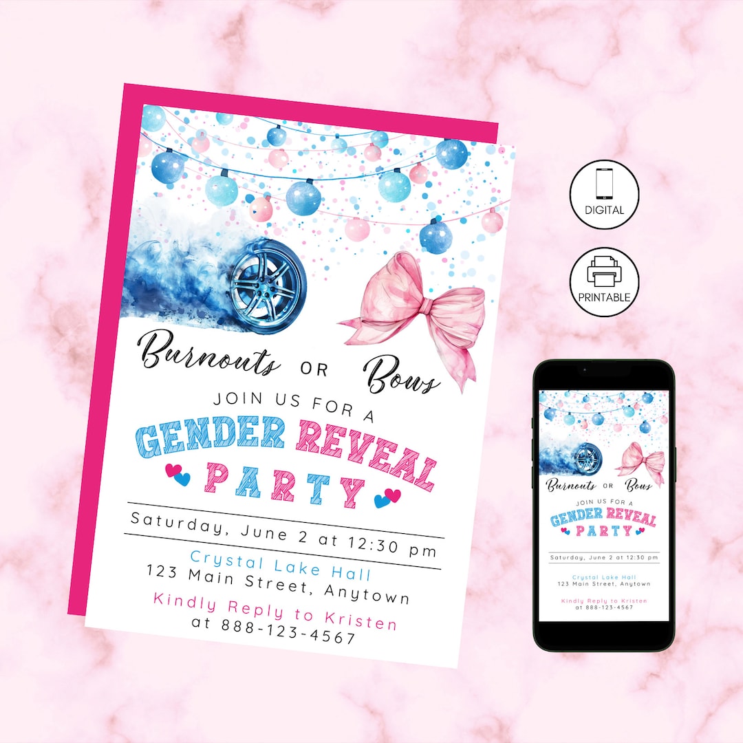 Burnouts or Bows Gender Reveal Invitation Bundle Instant Access