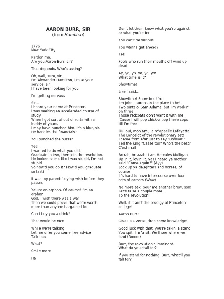 Aaron Burr Sir Lyrics Hamilton Musical