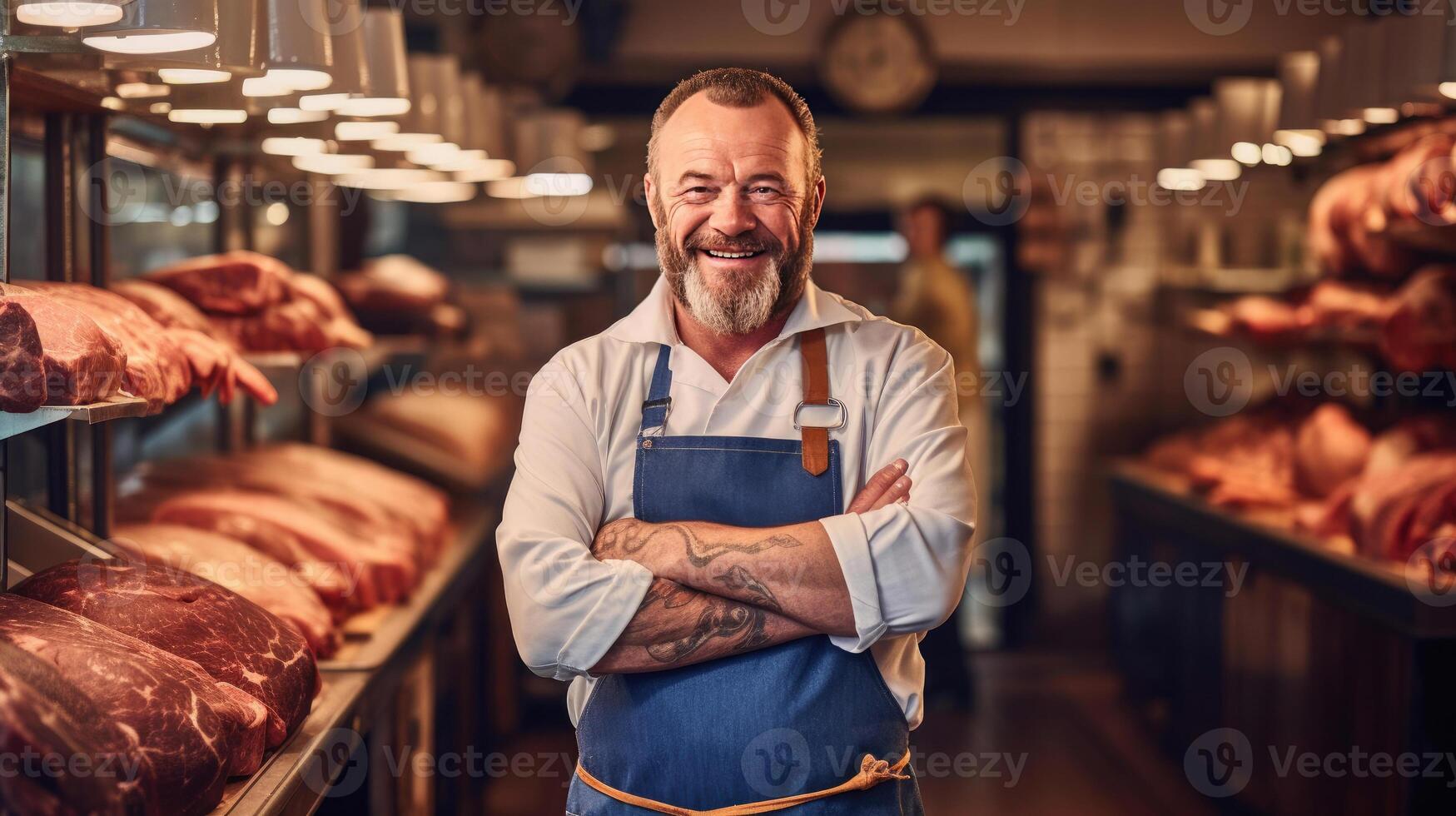 Portrait of A happy butcher standing with arms crossed in modern meat