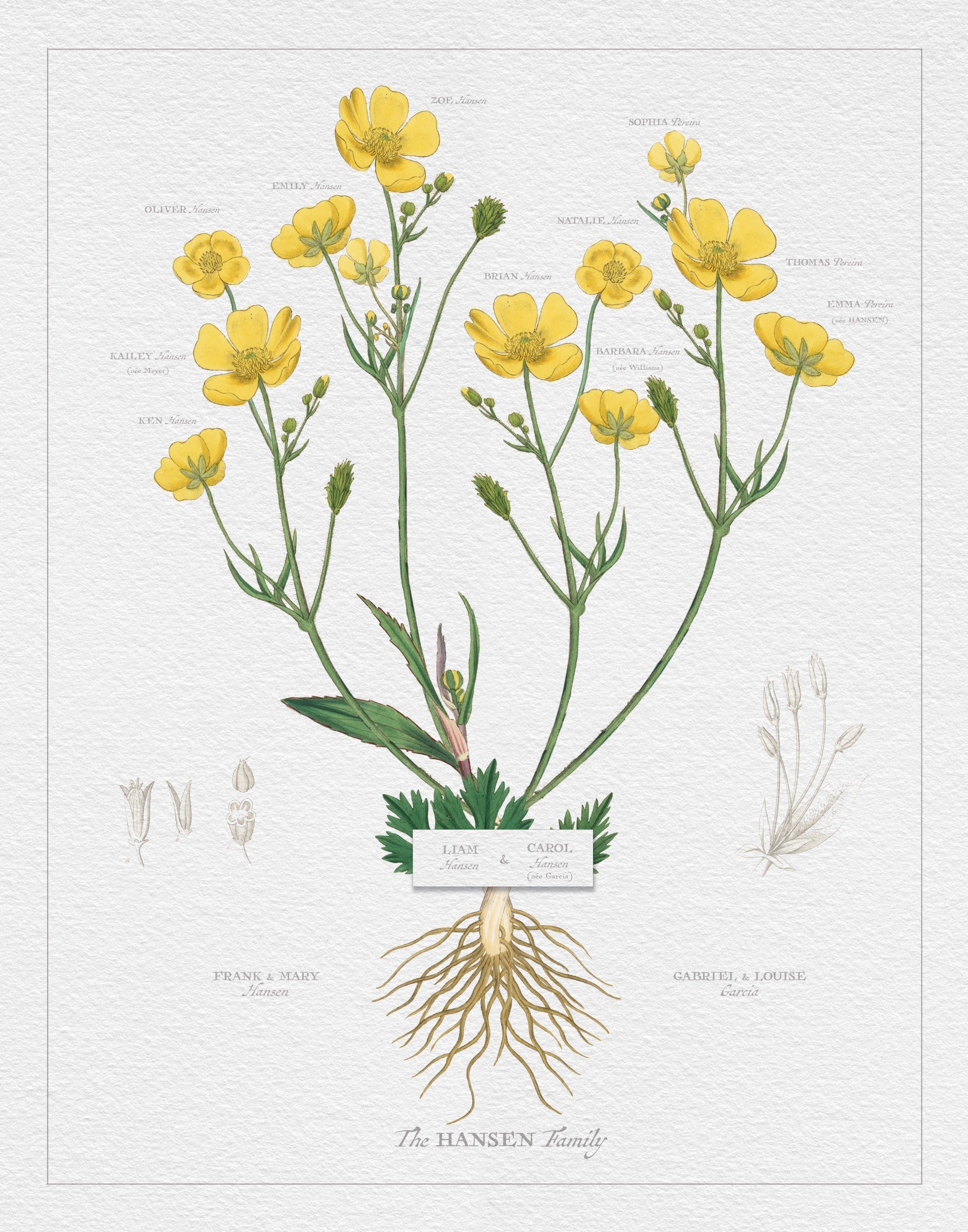 Classic Buttercup Family Botanic Custom Framed Family Tree Wall Art