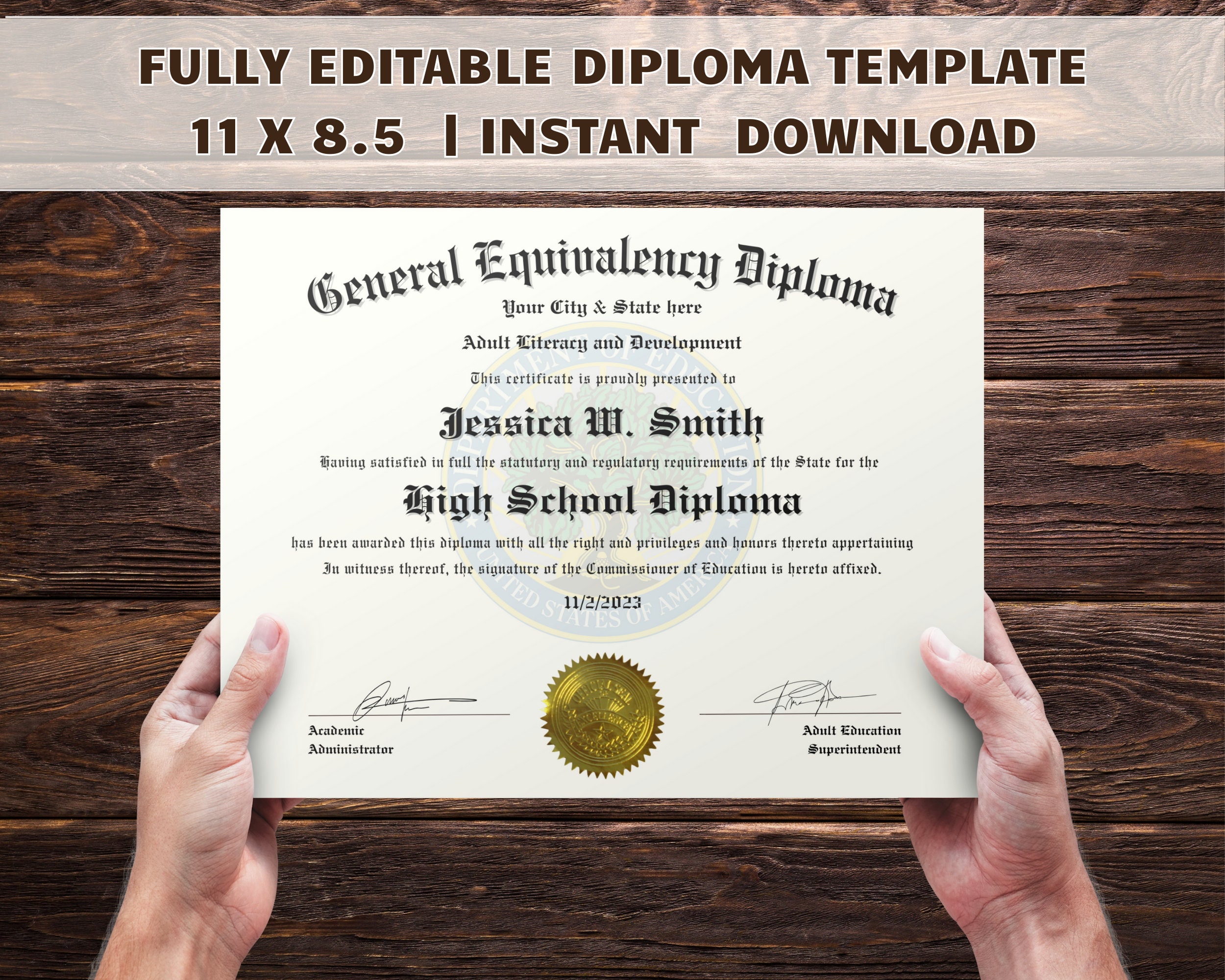 Editable GED Diploma With Gold Seal Printable High School Equivalency