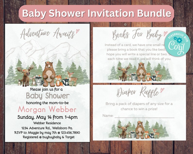 DIY Editable Woodland Baby Shower Invitation Books for Baby and Diaper