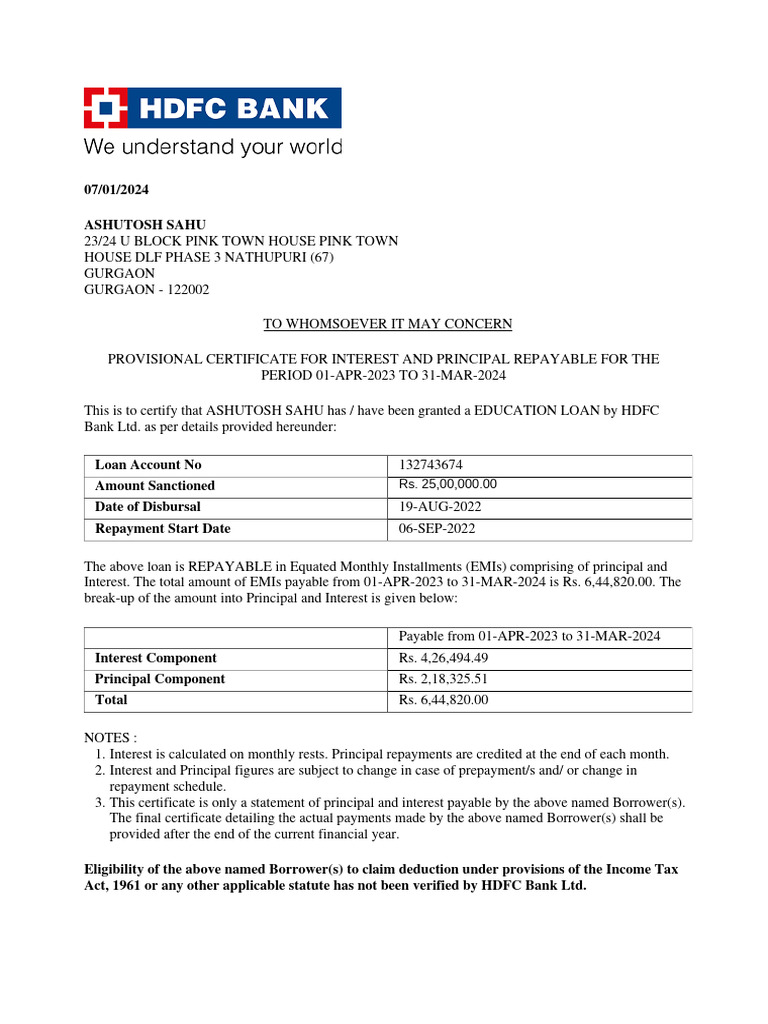 Education Loan Interest Certificate PDF