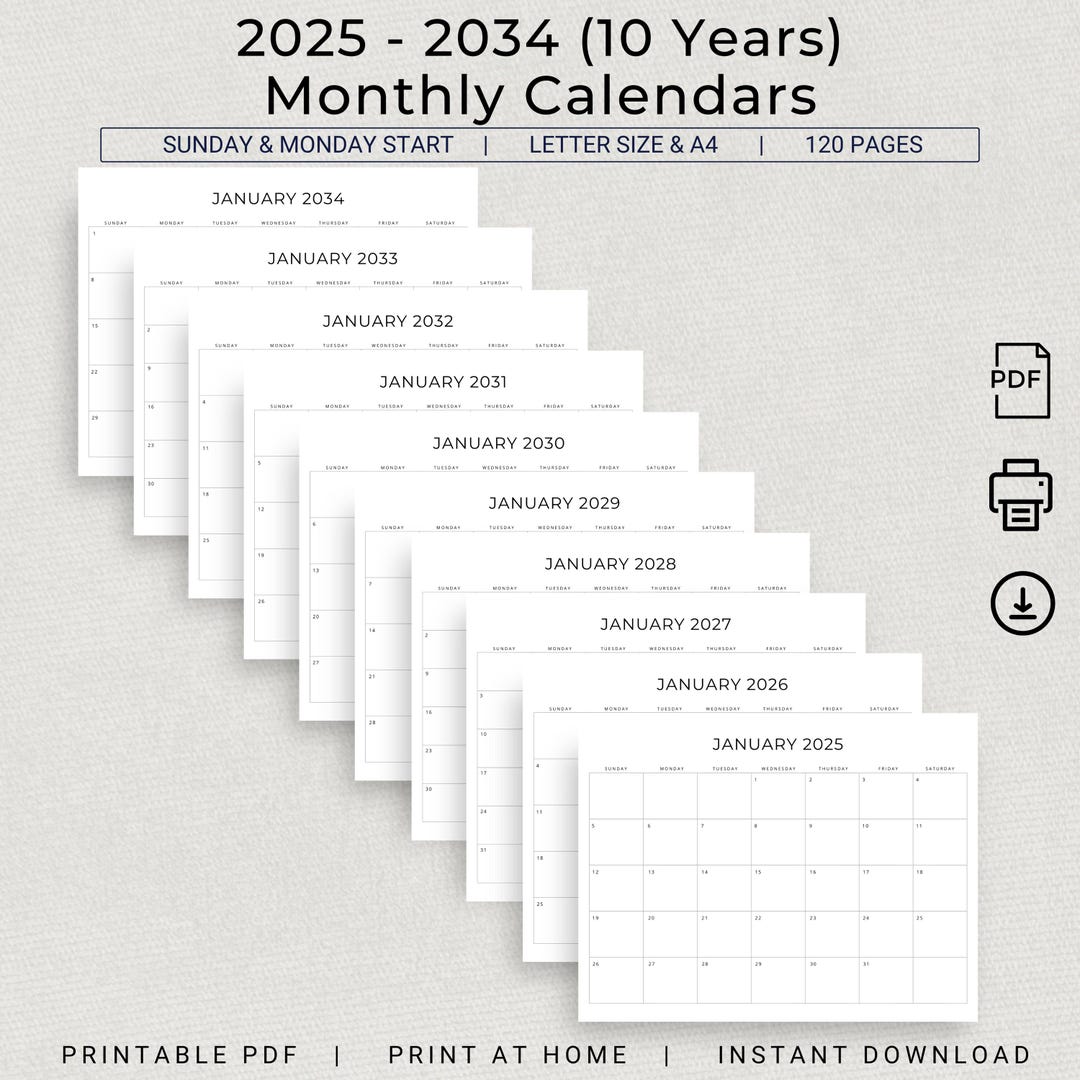 2025 to 2034 Calendar 2025 2034 Monthly Calendar 10 Years Planner