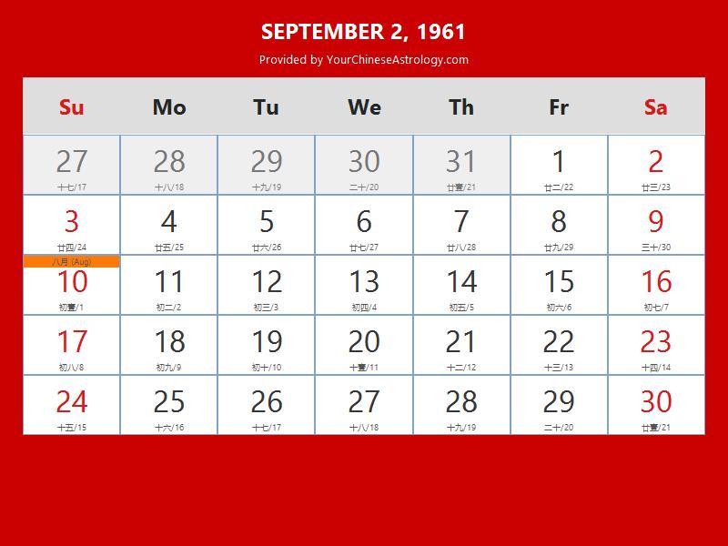 Chinese Calendar Sep 02 1961: Auspicious Things to Do and Hours Bazi