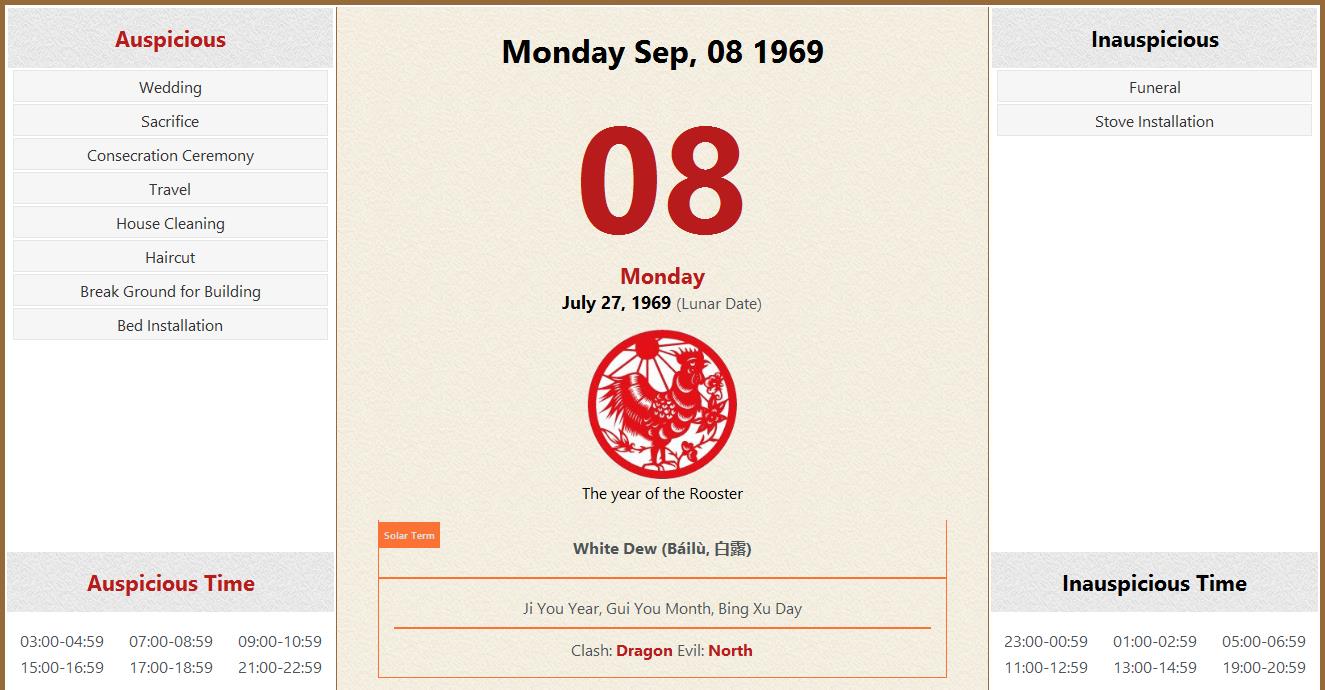 September 08 1969 Almanac Calendar: Auspicious/Inauspicious Events and