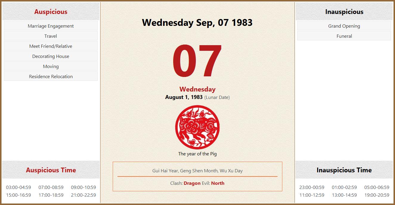 September 07 1983 Almanac Calendar: Auspicious/Inauspicious Events and