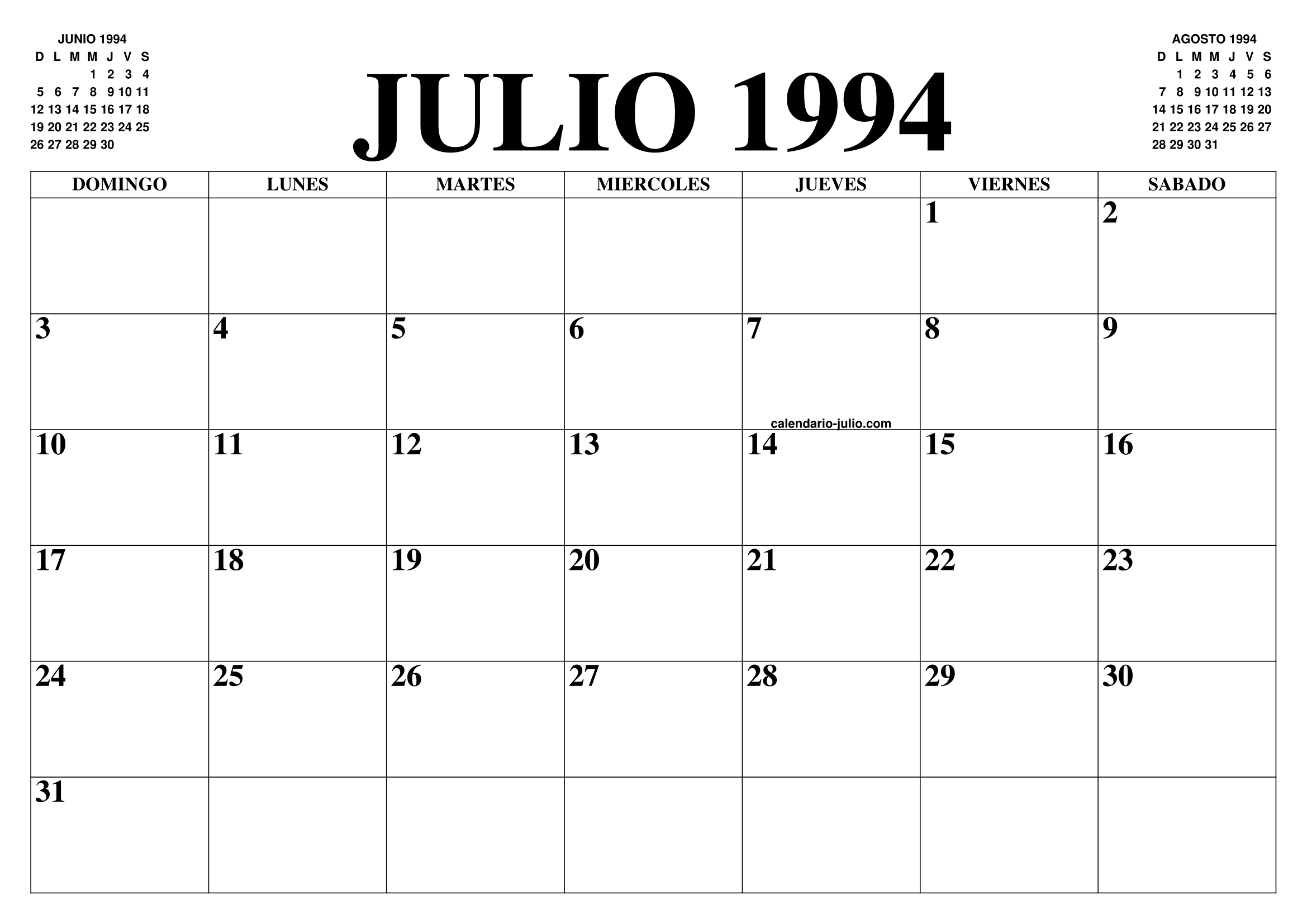 CALENDARIO JULIO 1994 : EL CALENDARIO JULIO PARA IMPRIMIR GRATIS MES