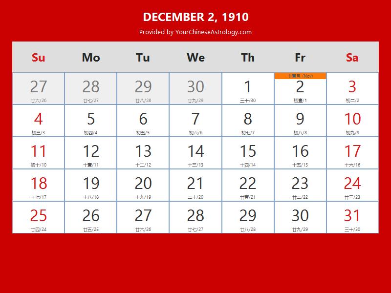 Chinese Calendar Dec 02 1910: Auspicious Things to Do and Hours Bazi