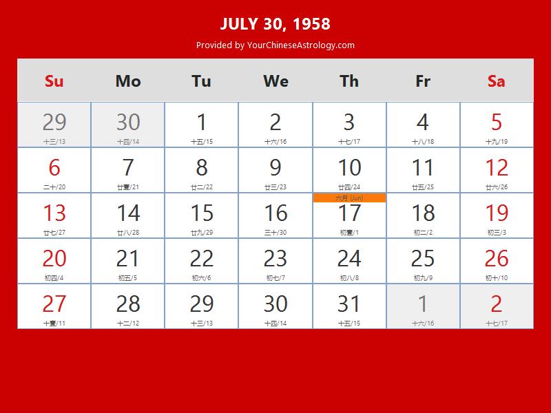 Chinese Calendar Jul 30 1958: Auspicious Things to Do and Hours Bazi