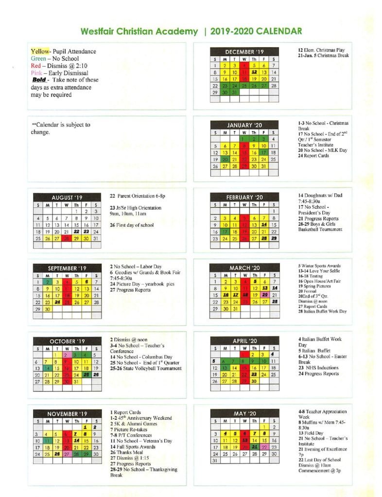 Calendar Westfair Christian Academy Jacksonville IL