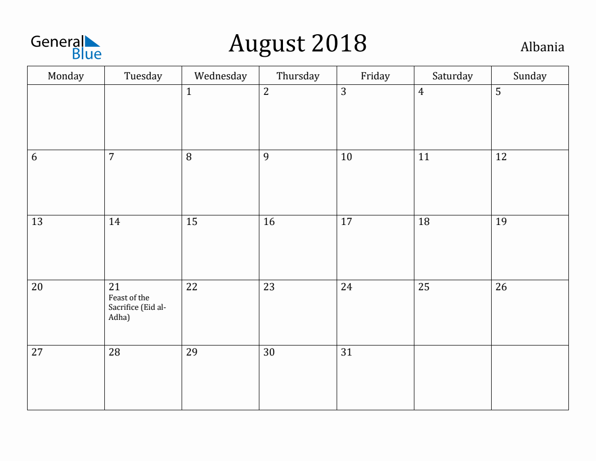 Albania Monthly Calendar August 2018 (Monday Start)