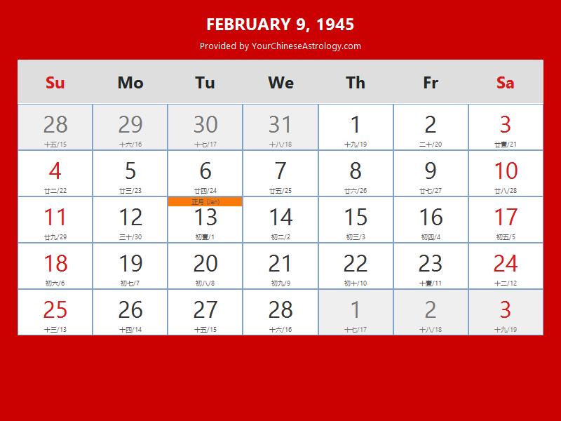 Chinese Calendar Feb 09 1945: Auspicious Things to Do and Hours Bazi
