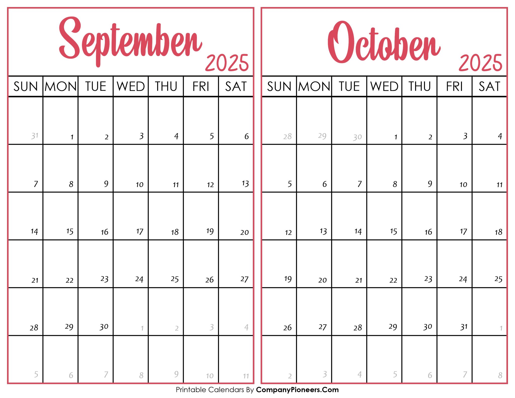 September and October 2025 Calendar Printable PDF Two Months Calendar