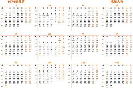 日历表1974日历 1974年日历全年完整图高清可打印免费下载 带节假日放假安排 日历精灵