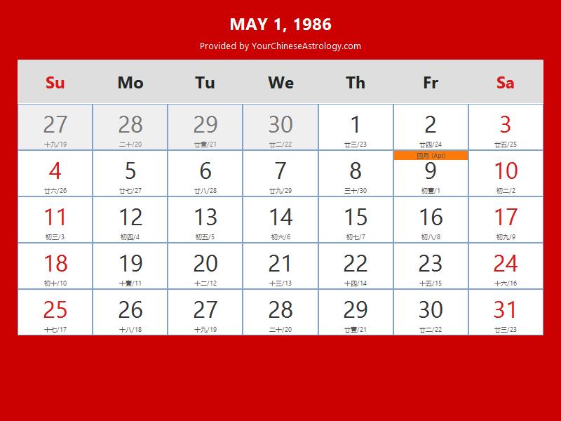 Chinese Calendar May 1986: Lunar Dates Auspicious Dates and Times