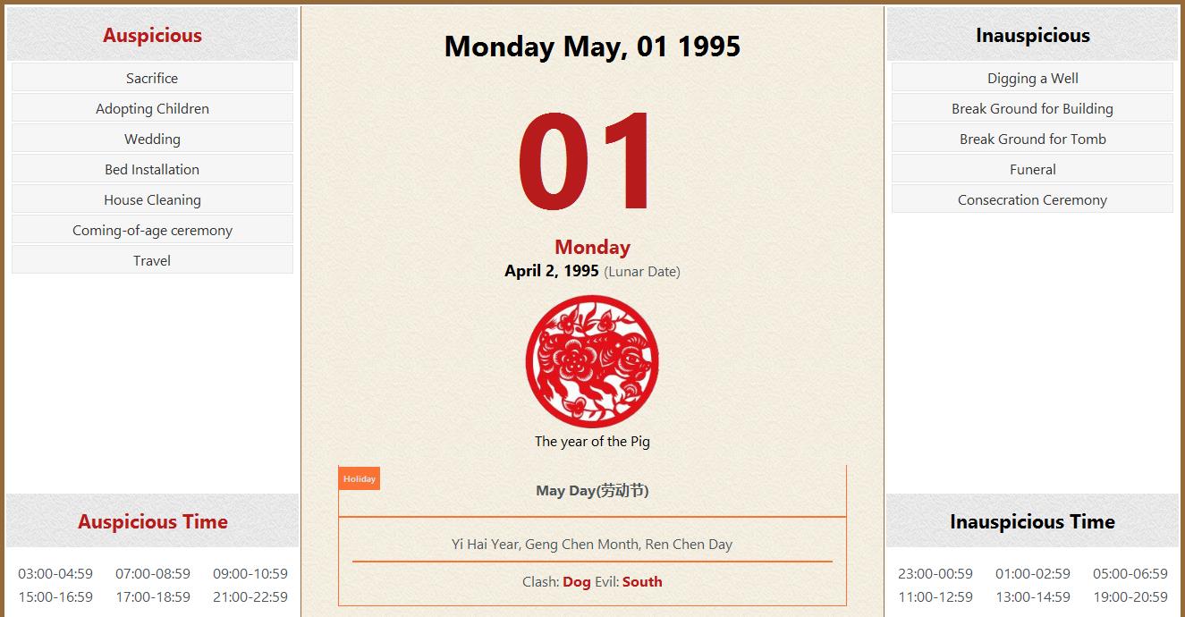 May 01 1995 Almanac Calendar: Auspicious/Inauspicious Events and Time