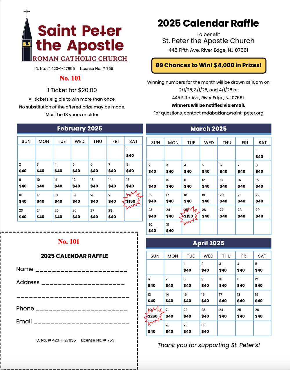 2025 Calendar Raffle St Joseph Church