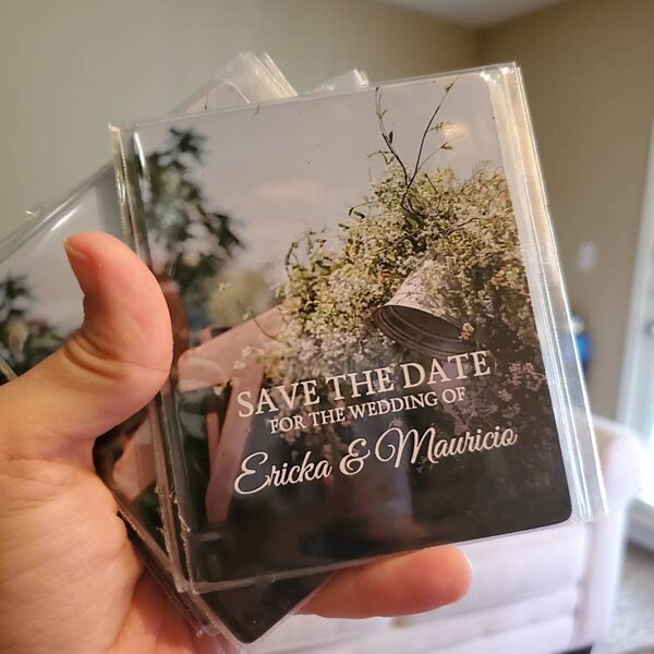 Home made save the date featuring a refrigerator magnet and a small