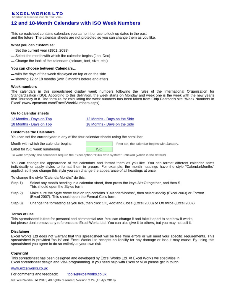 12 and 18 Month Calendars With ISO Week Numbers: What You Can Customise