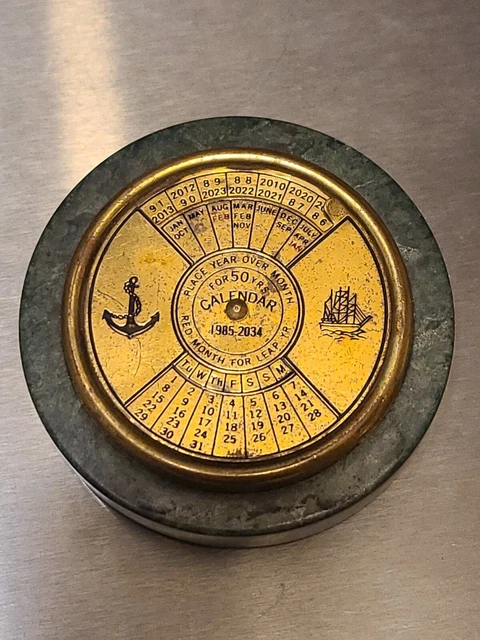TALL SHIP 50 year Perpetual Calendar Moss Agate Brass Face Paperweight