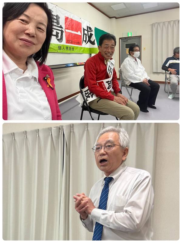 4/20彦根市長選1日目、小川吉則市議会議員が開催された「田島一成個人演説会」、車座での対話の 中沢けいこ(ナカザワケイコ