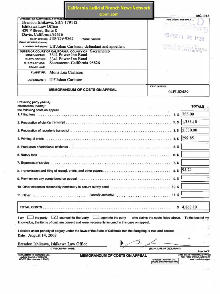 Memorandum of Costs on Appeal: Ulf Carlsson Appeal Third District