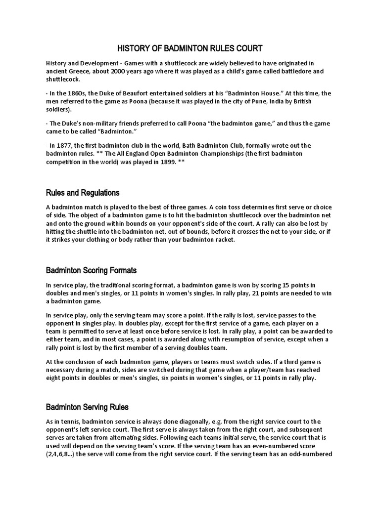 History of Badminton Rules Court 2 PDF Hobbies Racquet Sports