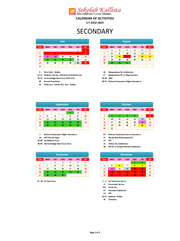 Academic Calendar Sekolah Kallista Secondary PDF Observances