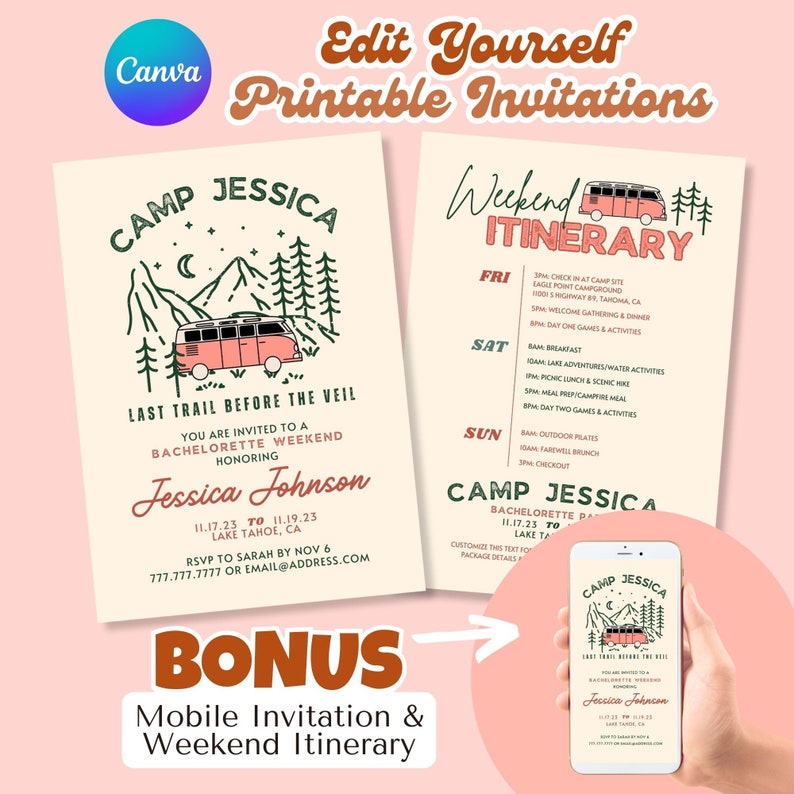 Printable Camp Bachelorette Mobile Invitation Itinerary Canva Template