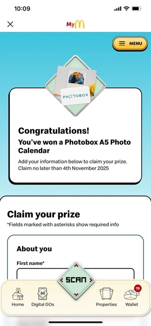 PHOTOBOX PERSONALISED CALENDAR McDonald s Monopoly Win 2025 Photo