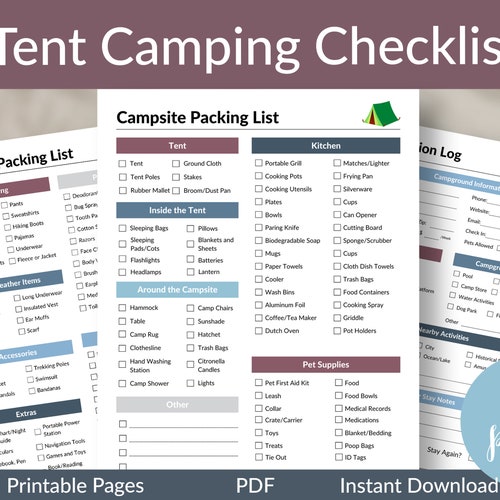 Printable Camping Checklist Planner Five Pages Tent Etsy