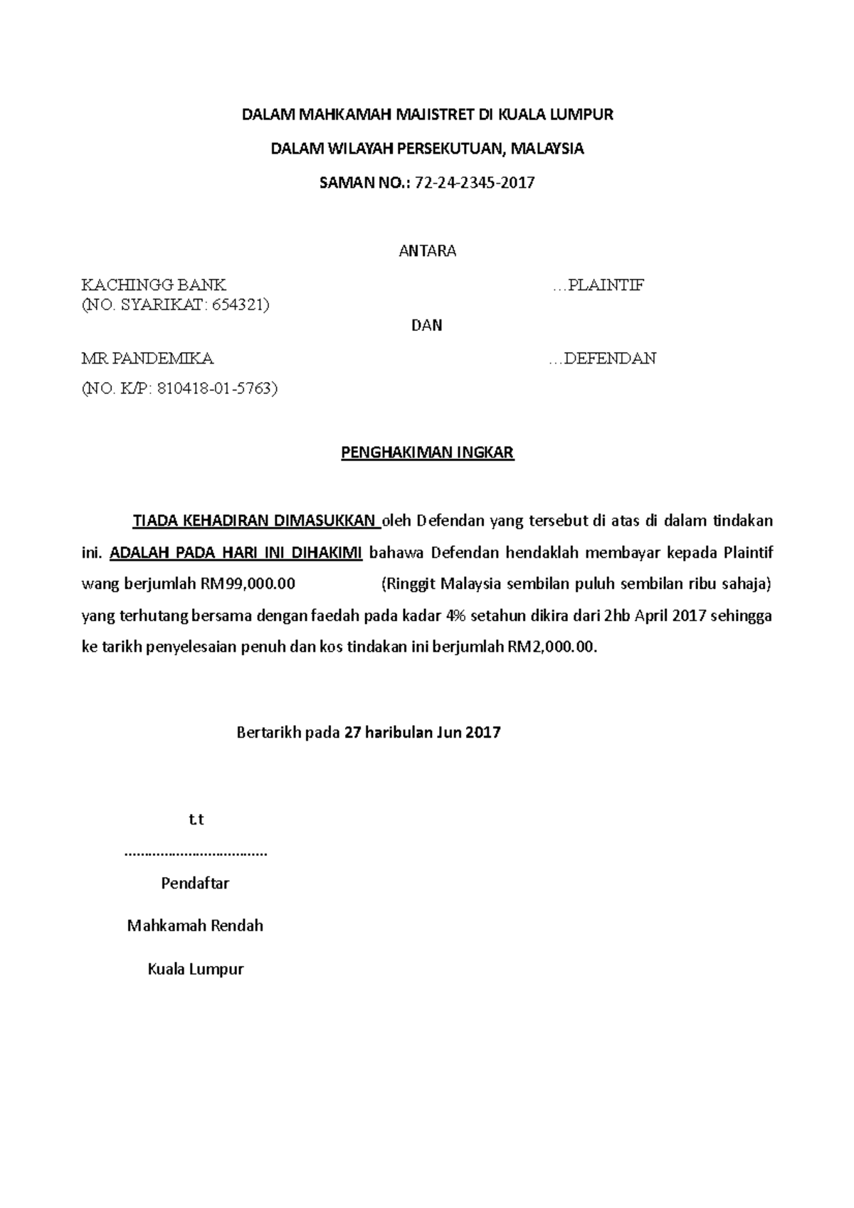 Bankruptcy 1 Judgement in Default Case: KACHINGG BANK vs MR PANDEMIKA